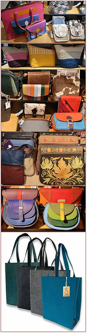 Handtassen, schoudertassen, boodschappentassen en een tasje voor je mobieltje en dopper. Gemaakt van o.a. leer, hennep, riet, etc.
